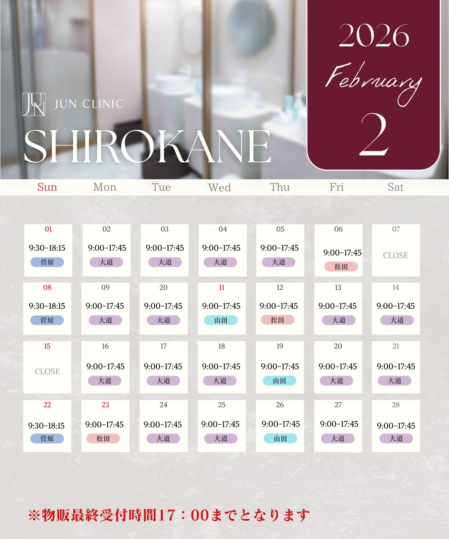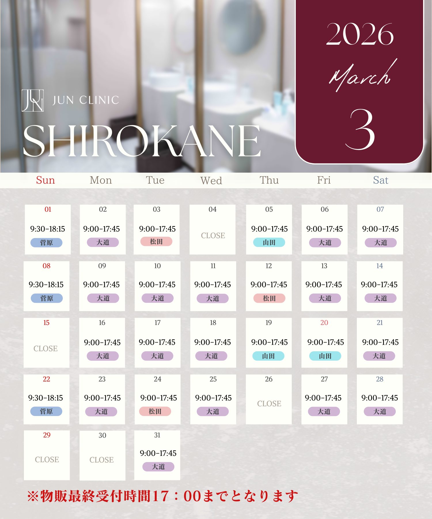- 月〜土 9:00〜17:45 / 日 9:30〜18:15