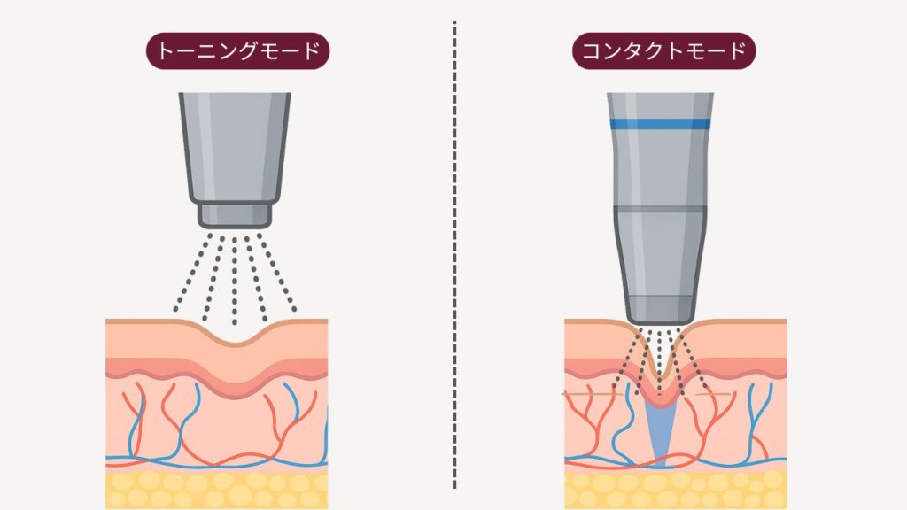 施術直後は赤み、腫れ、内出血が起こることがあります。モードによってダウンタイムは異なります。特にコンタクトモードの場合は1〜2週間の点状出血が残ることがあります。
