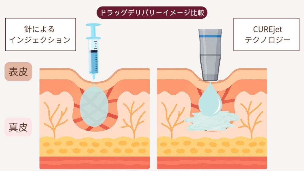 CUREjet(キュアジェット)はエアジェット(空気圧)方式によって、マイクロサブシジョンおよび皮膚の表皮から真皮層に様々な薬剤を注入することができる、針を使用しないエアジェット式マシンです。
